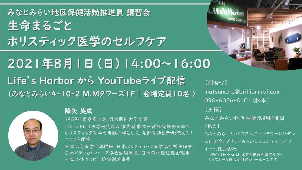 保健活動推進員 1 8月 2021 【予告】生命まるごと ホリスティック医学のセルフケア 2021年8月1日(日)14:00~16:00 Life’s Harbor から YouTubeライブ配信 (みなとみらい4-10-2 M.Mタワーズ1F | 会場定員10名 ) https://youtu.be/HpQZVhKlfp0 ※URL(QRコード)を知っている方のみの限定配信です。 … 続きを読む