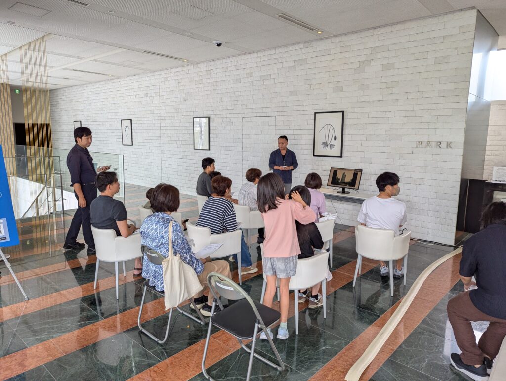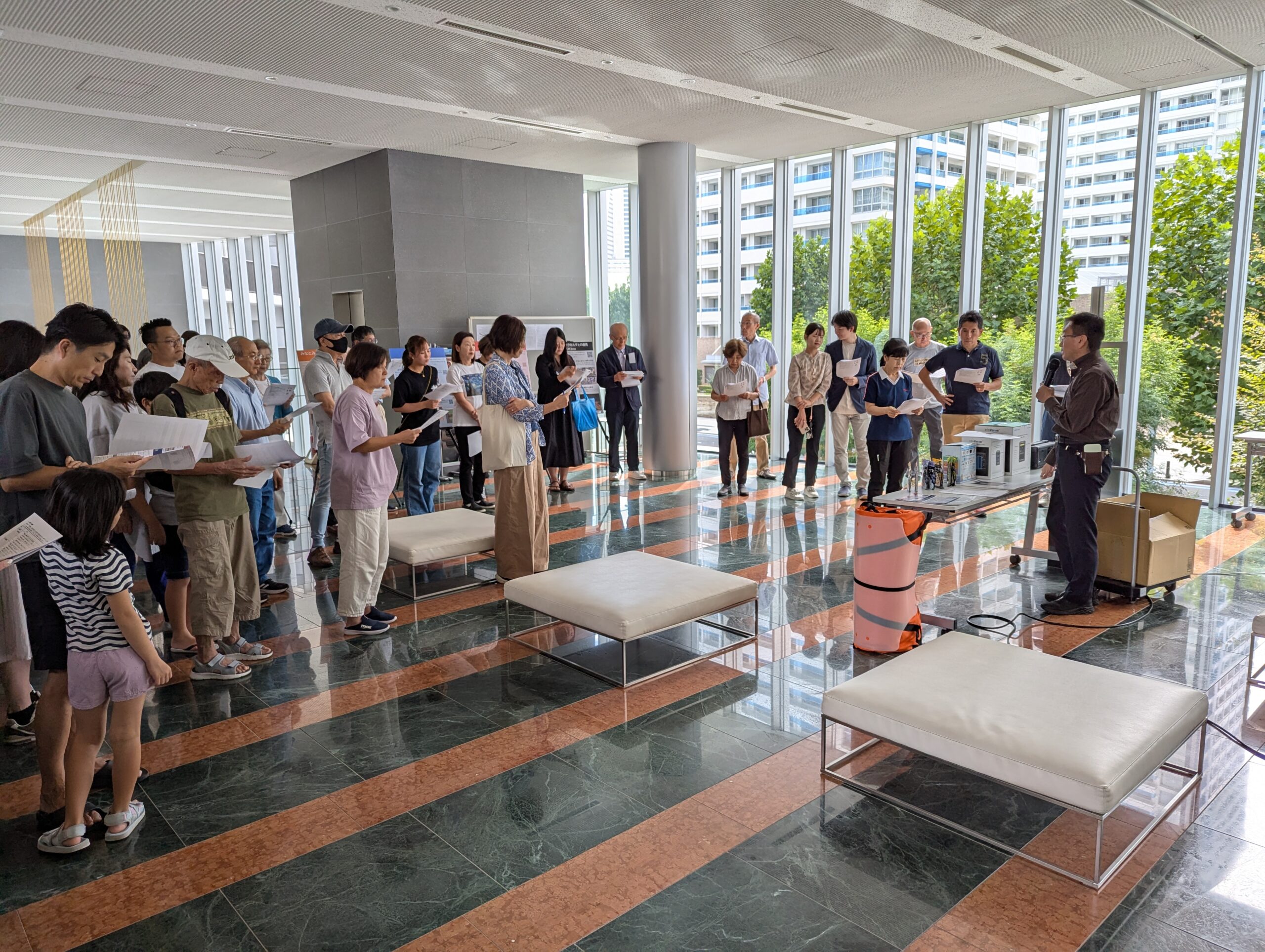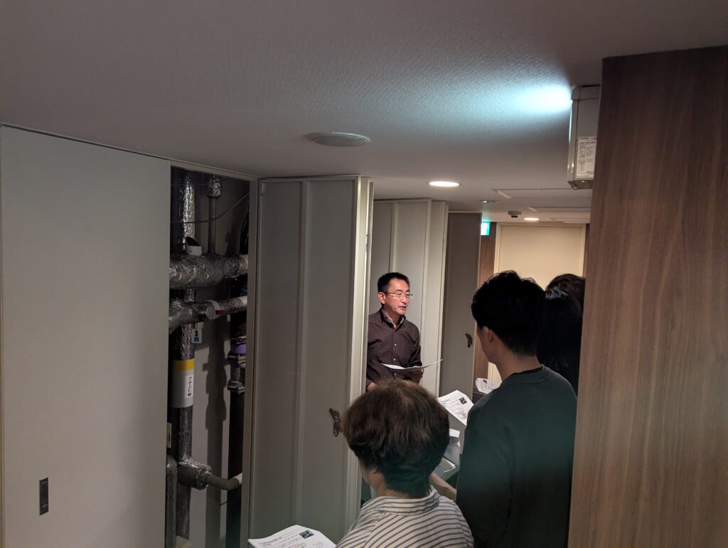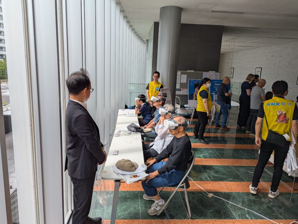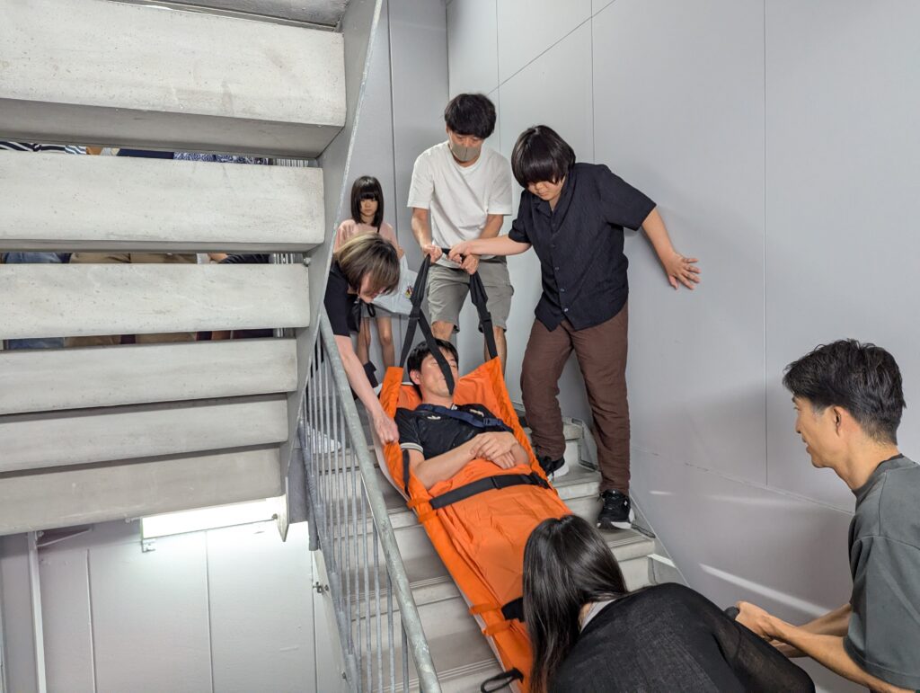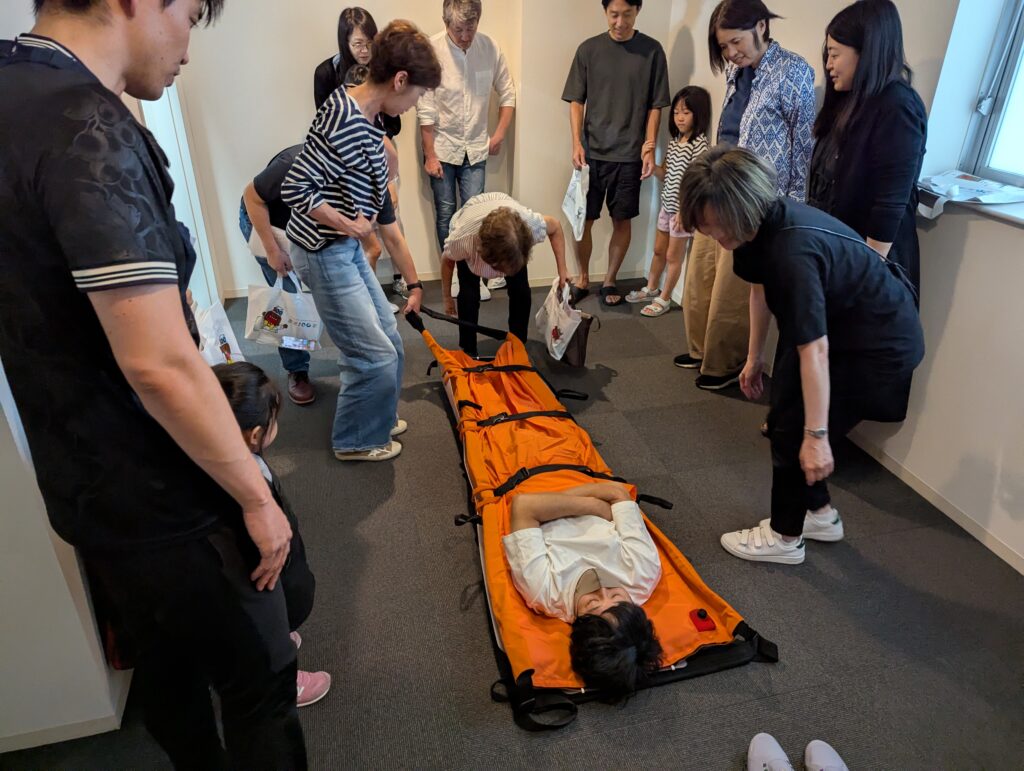 火災を想定した避難訓練で2階のロビーに参集をして、家庭備蓄品斡旋販売の紹介、地震を想定した安否確認訓練を行い、その後、3班に分かれて、①負傷者の階段搬送 |②メーターボックスの設備確認 |③高層ビルでの地震への備え(協力:NHK横浜放送局)をローテーションして行いました。 今年の防災訓練の参加者は48戸・65名。NHKの協力もあって、例年(2024年44名、2023年23名、2022年30名)より多くの方が参加しました。