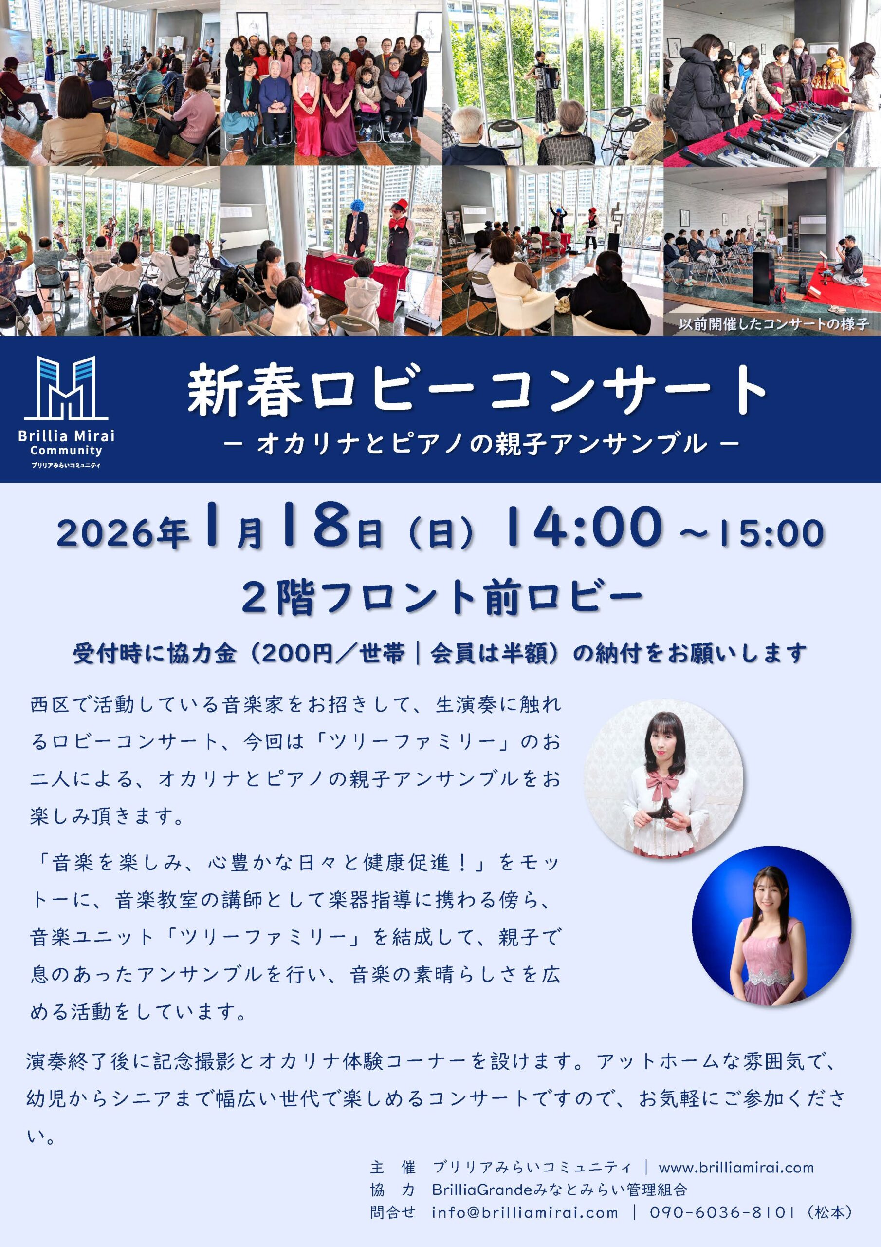 西区で活動している音楽家をお招きして、生演奏に触れるロビーコンサート、今回は「ツリーファミリー」のお二人による、オカリナとピアノの親子アンサンブルをお楽しみ頂きます。